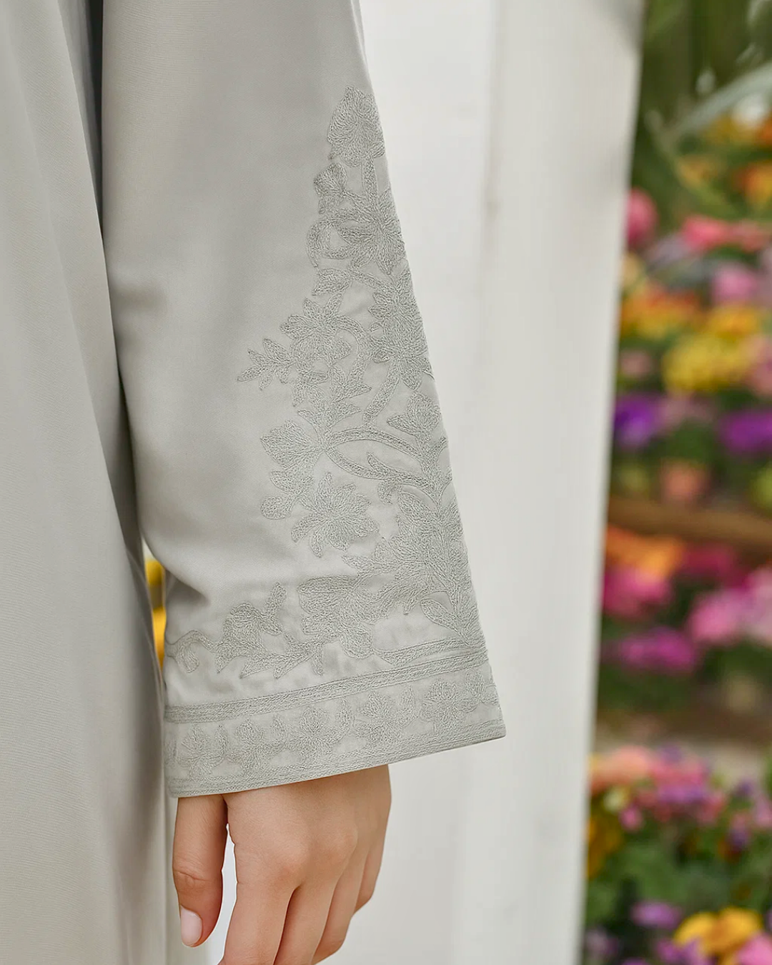Embellishment: Intricate embroidery on neckline and sleeves