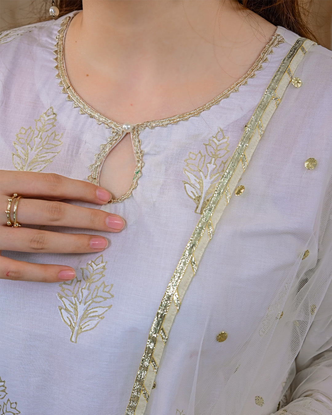 Embrace understated elegance with ASBP-104 Dobby Spring 2PCS – a block print masterpiece. This graceful 3-piece set features soft white dobby fabric, embellished with delicate gold motifs and intricate borders. Paired with a light organza dupatta accentuated by golden detailing, it brings a dreamy charm to your spring wardrobe.
